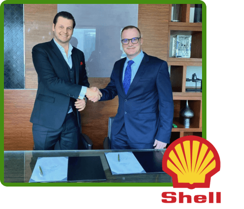 Notre PDG et le Directeur Général de l'économie circulaire des plastiques mondiaux chez Shell scellent l'accord par une poignée de main ferme lors de la signature de cet engagement entre les deux entreprises.